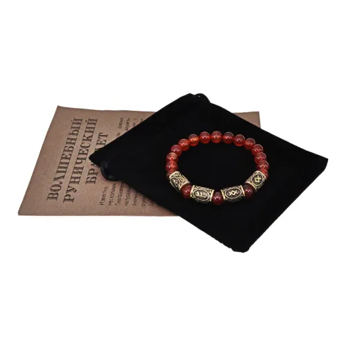 Стрейч-браслет с руническими символами и натуральным сердоликом, изготовленный из бижутерного сплава с покрытием под золото.
