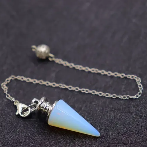 Маятник для биолокации из синтетического лунного камня и бижутерного сплава с покрытием под серебро. Высота изделия — 22,5 см, тип замка — лобстер.