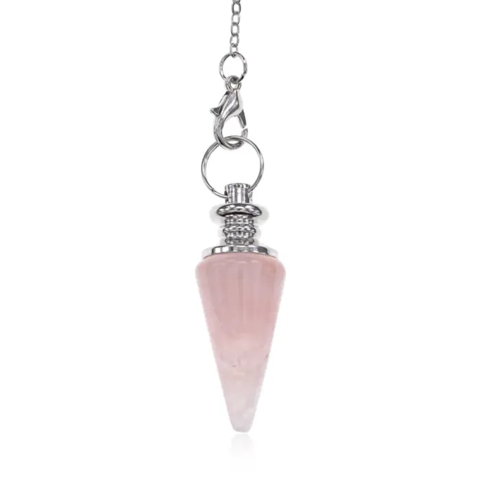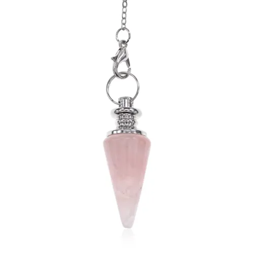 Маятник для биолокации из бижутерного сплава с покрытием под серебро и натурального розового кварца. Тип замка — лобстер.