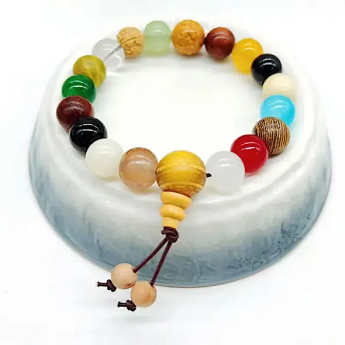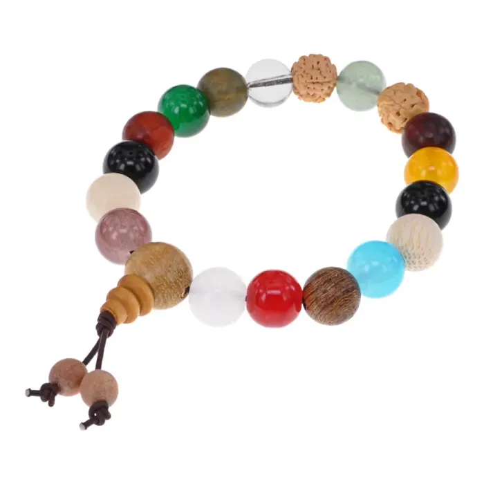 Материал и изготовление: Изготовлен из бусин: дерево, натуральные и синтетические камни, рудракша, стекло.