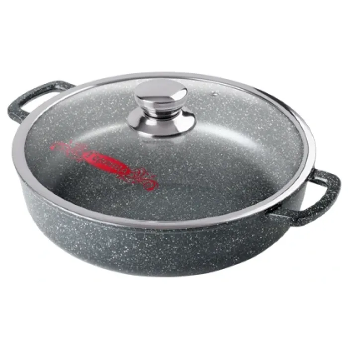 - Материал: литой алюминий с антипригарным покрытием- Размеры: диаметр 28 см, высота 7 см- Толщина: дна 4.5 мм, стенок 3.5 мм- Комплектация: жаровня со стеклянной крышкой- Совместимость: подходит для различных типов плит- Особенности ухода: рекомендуется использовать для мытья мягкие губки, чтобы не повредить антипригарный слой