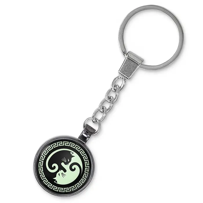 Брелок для ключей с изображением котов в виде символа Инь-Ян. Изготовлен из бижутерного сплава с покрытием под сталь, имеет светящийся элемент.