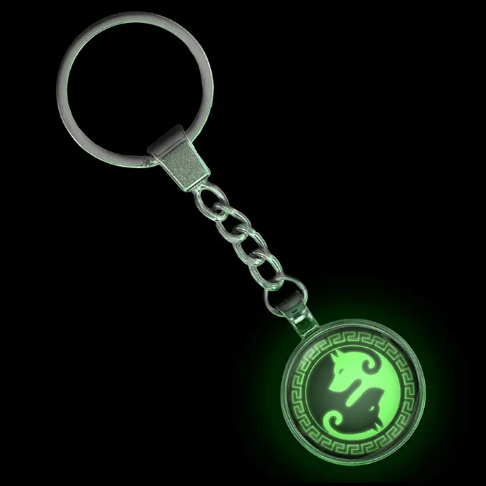 Брелок для ключей с изображением собаки в стиле инь-ян. Изготовлен из бижутерного сплава, обладает функцией свечения в темноте.