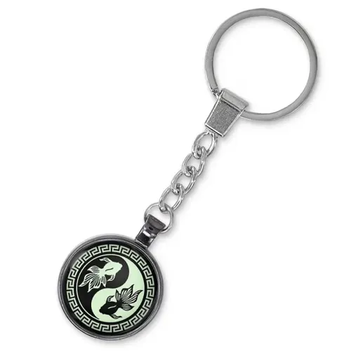 Брелок для ключей из бижутерного сплава с изображением золотых рыбок в виде символа Инь-Ян под защитным стеклом. Имеет функцию свечения в темноте.