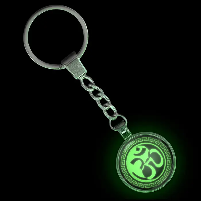 Светящийся брелок с символом Ом и Инь-Ян. Изготовлен из бижутерного сплава с покрытием под сталь, заряжается от света.