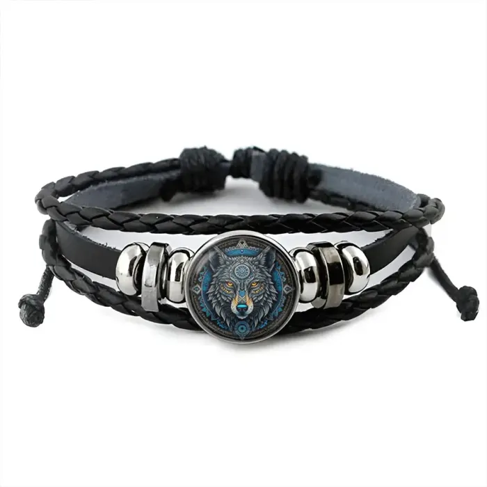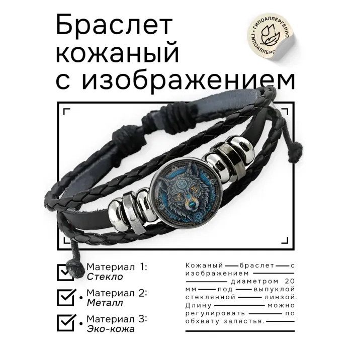 Кожаный браслет с декоративным элементом в виде волка. Изготовлен из синтетической кожи, металла и стекла.