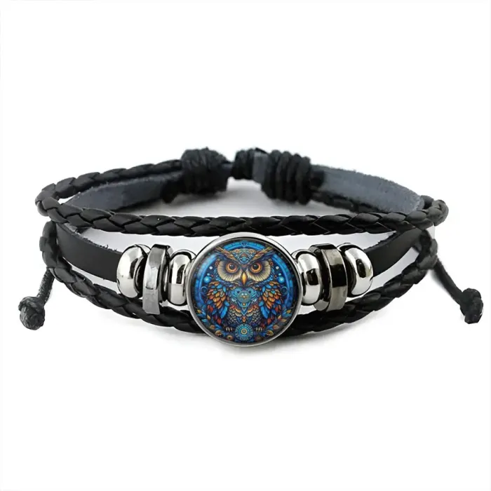 Кожаный браслет с изображением совы. Изготовлен из синтетической кожи, металла и стекла. Дизайн включает выпуклую стеклянную линзу.