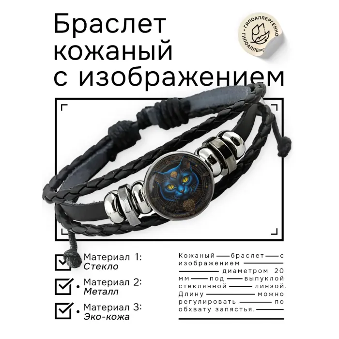 Кожаный браслет с изображением кота. Изготовлен из синтетической кожи, металла и стекла. Изображение диаметром 20 мм расположено под выпуклой стеклянной линзой.