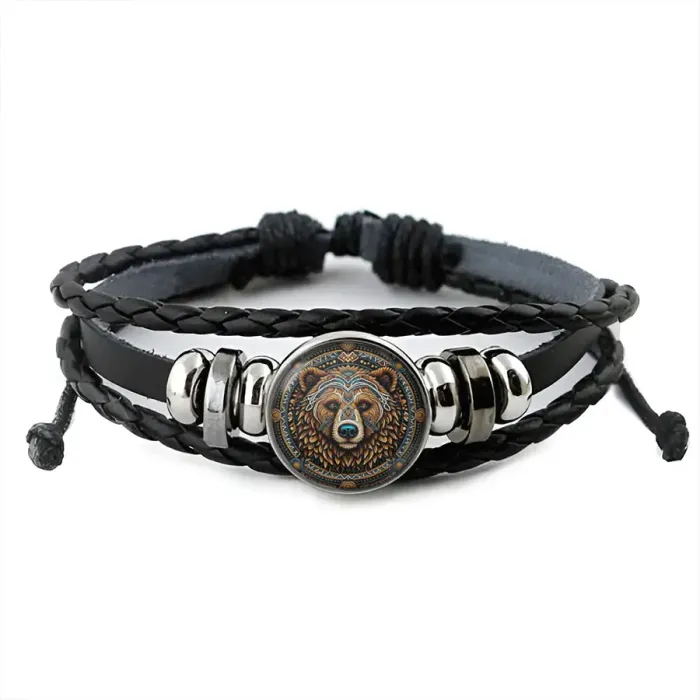Кожаный браслет с декоративным элементом в виде медведя под стеклянной линзой.