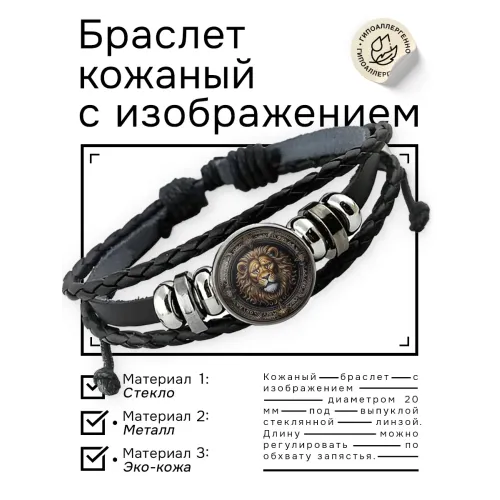 Кожаный браслет с изображением льва — стильный аксессуар, который подчеркнёт индивидуальность. Изготовленный из синтетической кожи, металла и стекла, он отличается прочностью и долговечностью. Диаметр изображения составляет 20 мм, а регулируемый размер позволяет удобно носить браслет на любом запястье. Упаковка выполнена в виде прозрачного пакета, что делает его идеальным вариантом для подарка или личного использования. Этот браслет станет не только модным дополнением образа, но и символом силы и уверенности.