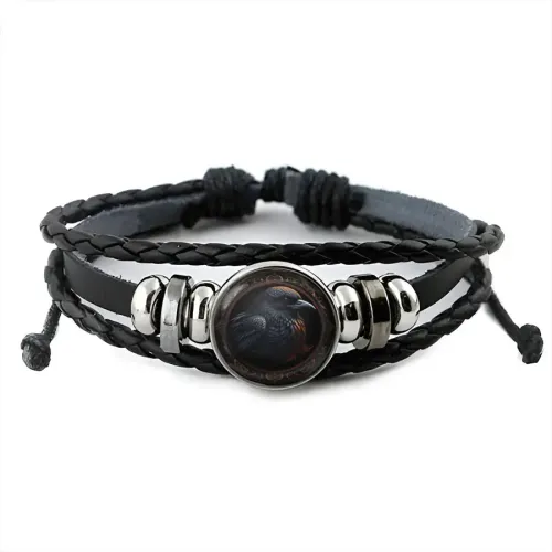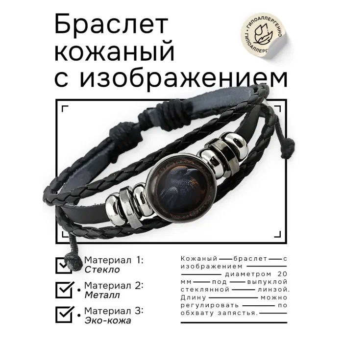 Кожаный браслет с декоративным элементом в виде птицы под стеклянной линзой.
