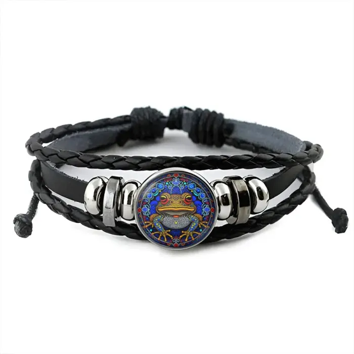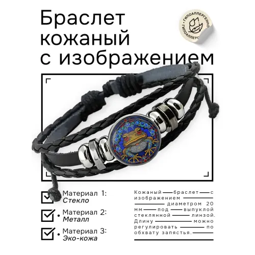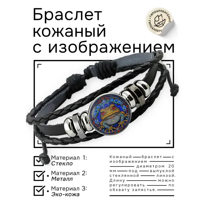 Кожаный браслет с декоративным элементом в виде разноцветной жабы.