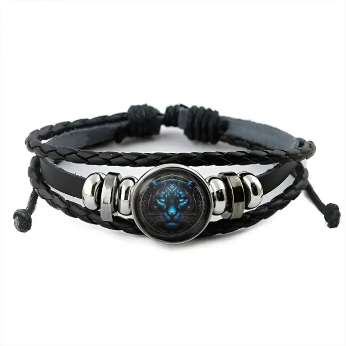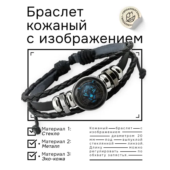 Кожаный браслет с декоративным элементом в виде пантеры под стеклянной линзой.