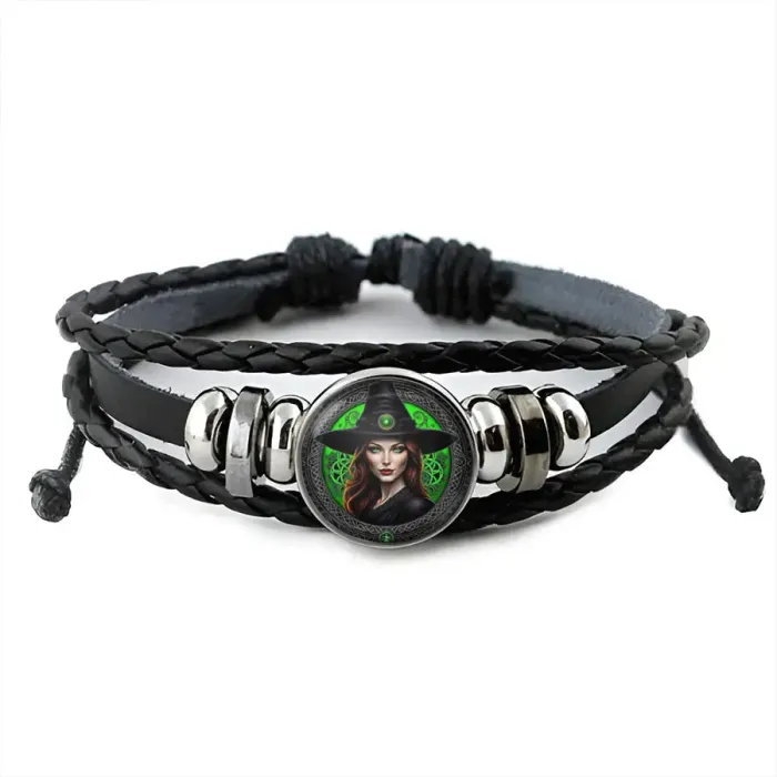 Кожаный браслет с декоративным элементом под стеклянной линзой.