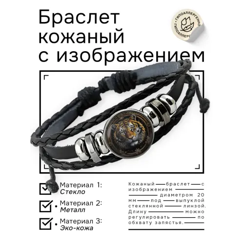 Кожаный браслет с декоративным элементом в виде изображения молодого тигра под стеклянной линзой.