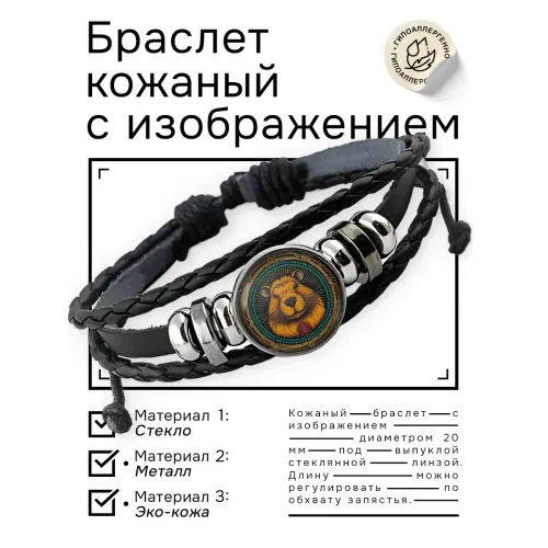 Кожаный браслет с декоративным элементом под стеклянной линзой.