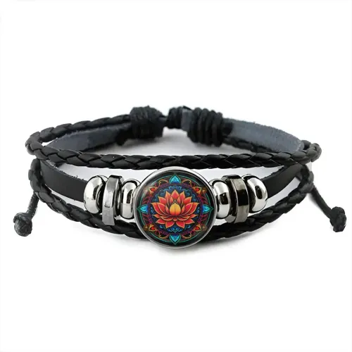 Кожаный браслет с изображением оранжевого лотоса под стеклянной линзой.