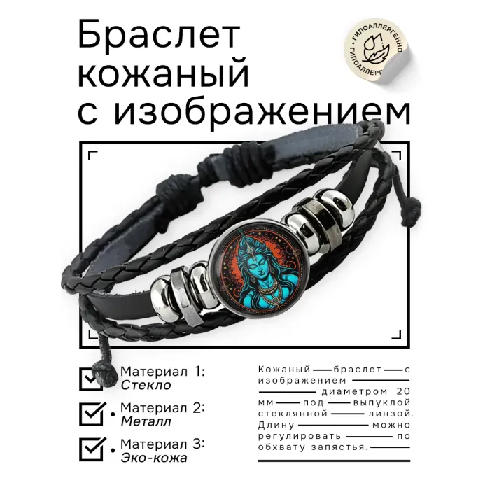 Кожаный браслет с изображением Шивы — это не только стильный аксессуар, но и символ духовной силы. С диаметром изображения 20 мм под выпуклой стеклянной линзой, он придаёт особую изюминку любому образу. Регулируемый по обхвату запястья, этот браслет подходит для любого размера руки. Изготовленный из качественной синтетической кожи, металла и стекла, он обеспечивает долговечность и комфорт в носке. Упакован в прозрачный пакет, что делает его отличным вариантом для подарка или личного использования.