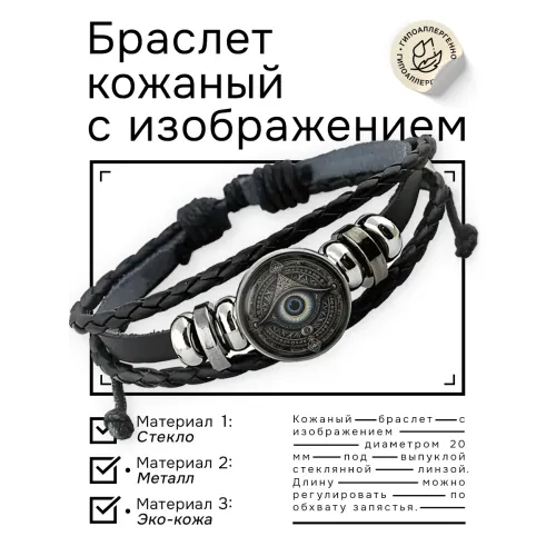 Кожаный браслет с декоративным элементом в виде глаза под стеклянной линзой.