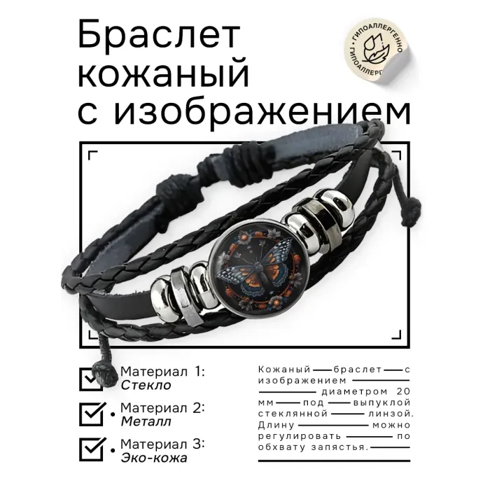 Кожаный браслет с декоративным элементом в виде бабочки.