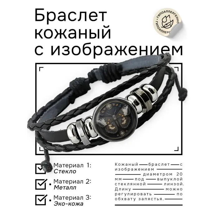 Кожаный браслет с декоративным элементом в виде бабочки под выпуклой стеклянной линзой.