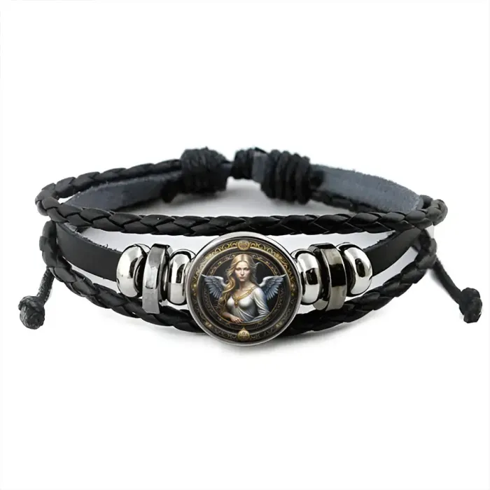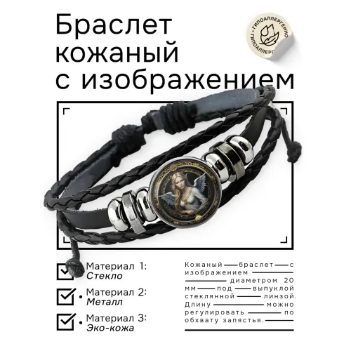 Кожаный браслет с декоративным элементом в виде ангела. Изготовлен из синтетической кожи, металла и стекла.