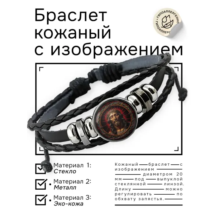 Кожаный браслет с изображением Иисуса Христа и терновым венцом. Основной элемент — изображение под выпуклой стеклянной линзой.