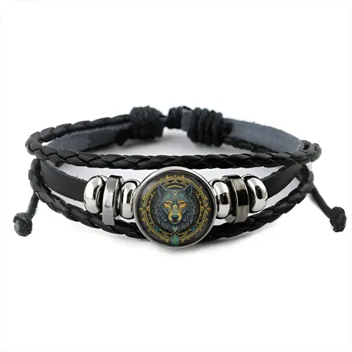 Кожаный браслет с изображением волка под стеклянной линзой.