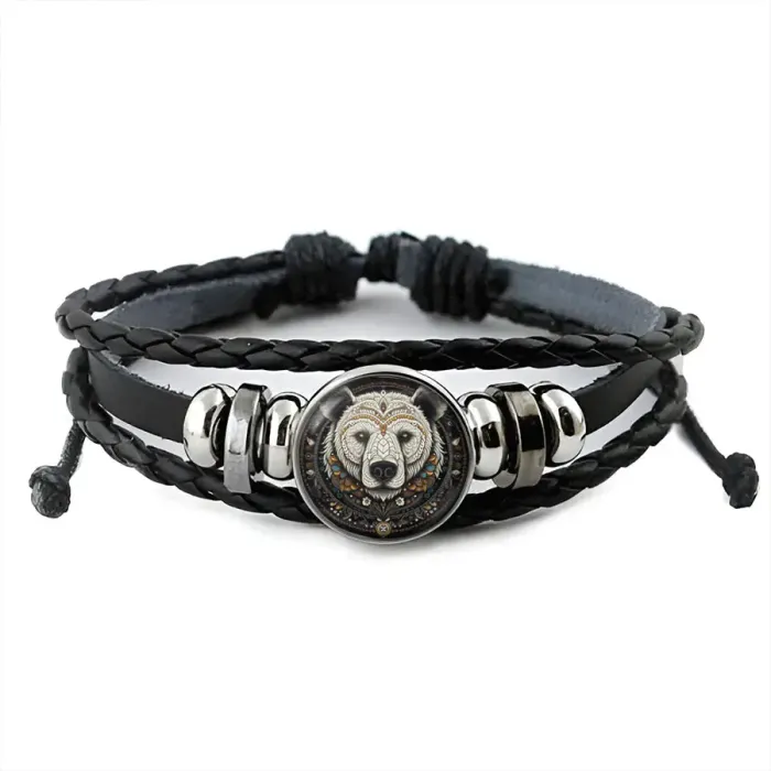 Кожаный браслет с изображением медведя под выпуклой стеклянной линзой.