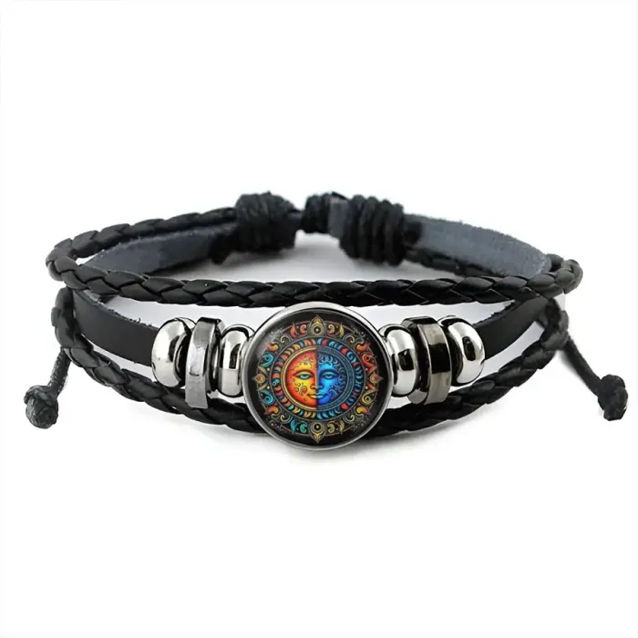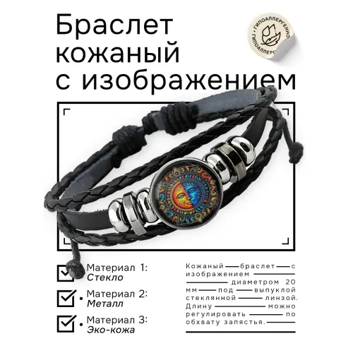 Кожаный браслет с изображением Солнца и символом Инь-Ян. Изображение диаметром 20 мм защищено выпуклой стеклянной линзой.