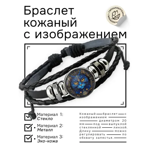 Кожаный браслет с изображением голубой кошки. Изготовлен из синтетической кожи, металла и стекла, имеет регулируемый обхват запястья.