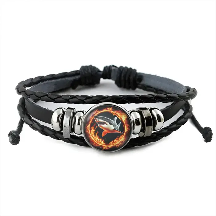 Кожаный браслет с декоративным элементом в виде выпуклой стеклянной линзы.