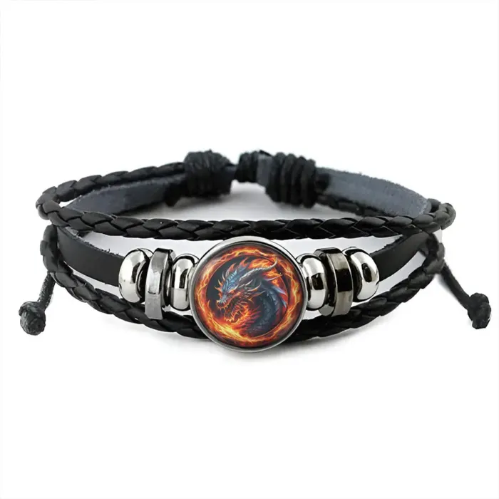 Кожаный браслет с изображением Огненного дракона. Изготовлен из синтетической кожи, металла и стекла. Диаметр изображения 20 мм под выпуклой стеклянной линзой.