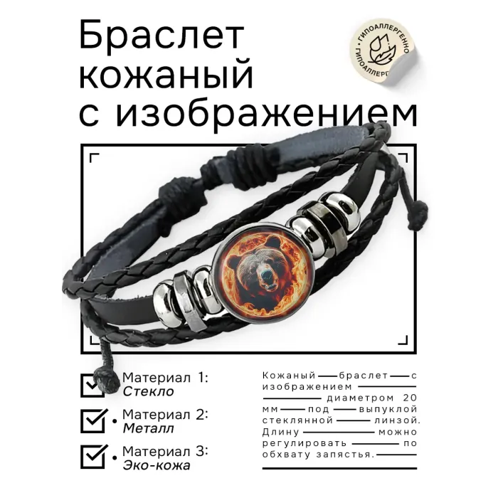 Кожаный браслет с декоративным элементом в виде Огненного медведя. Изображение расположено под выпуклой стеклянной линзой.