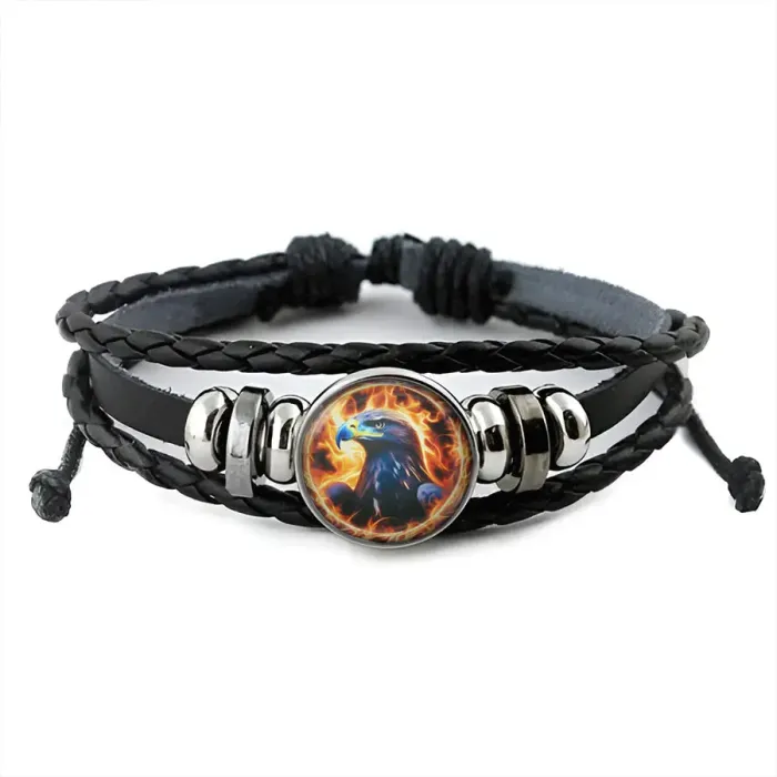 Кожаный браслет с декоративным элементом. Изготовлен из синтетической кожи, металла и стекла. Ключевая особенность — изображение под выпуклой стеклянной линзой.