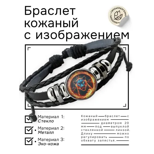 Кожаный браслет с декоративным элементом в виде изображения пантеры.