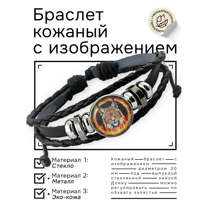 Кожаный браслет с декоративным элементом в виде Огненной рыси. Изготовлен из синтетической кожи, металла и стекла.