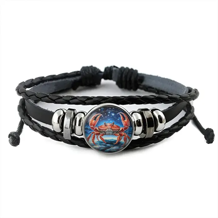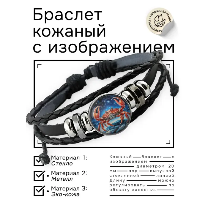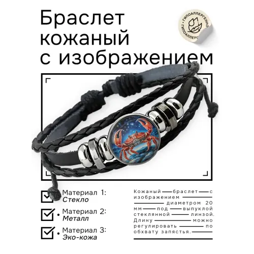 Кожаный браслет с изображением знака зодиака Рак. Изготовлен из синтетической кожи, металла и стекла.
