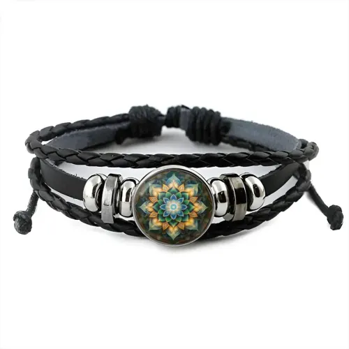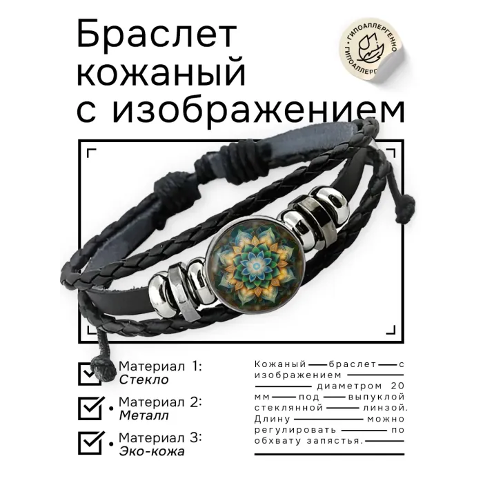 Кожаный браслет с изображением зелёной мандалы — это стильный аксессуар, который не только дополняет образ, но и символизирует гармонию и баланс. Изготовленный из синтетической кожи, металла и стекла, он отличается прочностью и долговечностью.