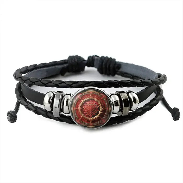 Кожаный браслет с декоративным элементом. Основные материалы: синтетическая кожа, металл и стекло. Ключевая особенность — изображение мандалы диаметром 20 мм под выпуклой стеклянной линзой.