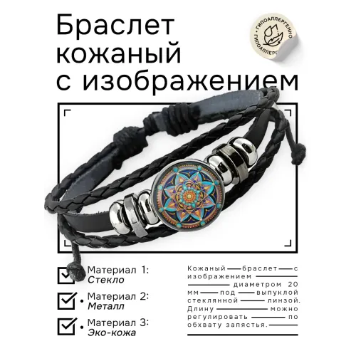 Кожаный браслет с декоративным элементом под стеклянной линзой. Материалы: синтетическая кожа, металл, стекло.