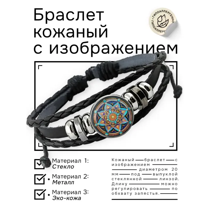 Размеры и комплектация: Браслет имеет регулируемый размер. Упаковка: прозрачный пакет.