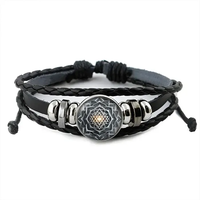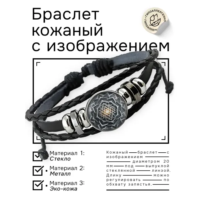 Кожаный браслет с декоративным элементом под стеклянной линзой.
