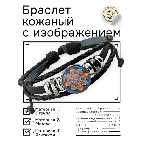 Кожаный браслет с изображением символа цветка жизни под стеклянной линзой.