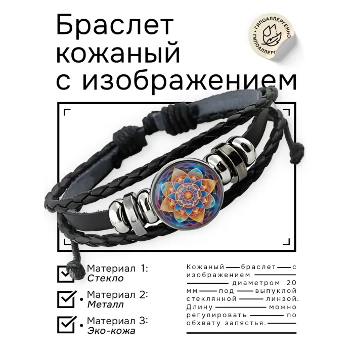 Размеры и комплектация: Диаметр изображения 20 мм. Браслет с регулируемым размером. Упаковка — прозрачный пакет.
