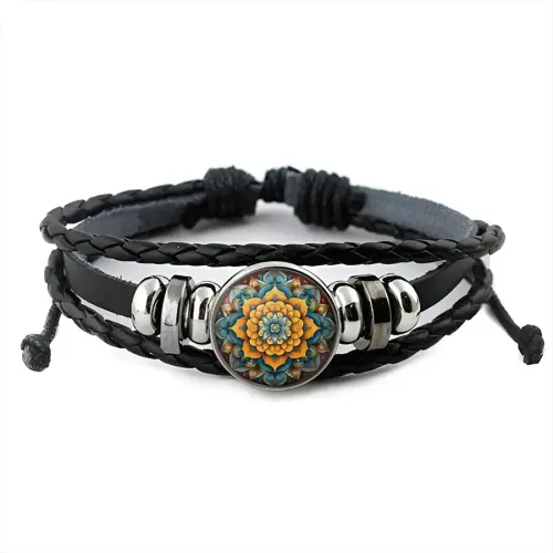 Кожаный браслет с декоративным элементом в виде оранжевого цветка жизни.