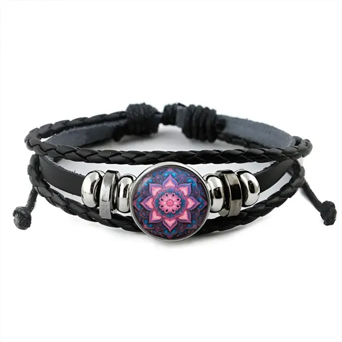 Кожаный браслет с декоративным элементом в виде розового цветка жизни.