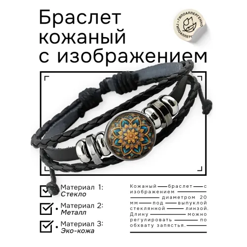 Кожаный браслет с цветочным узором. Изготовлен из синтетической кожи, металла и стекла.