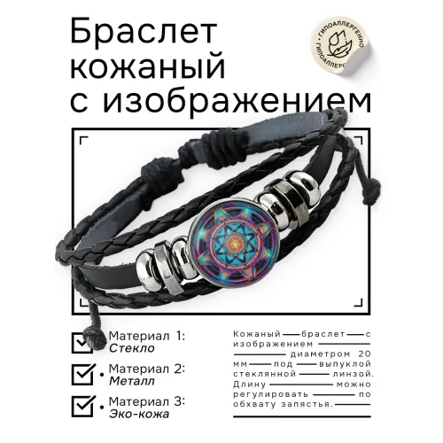 Кожаный браслет с декоративным элементом под стеклянной линзой. Изготовлен из синтетической кожи, металла и стекла.