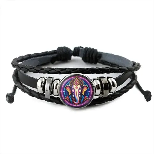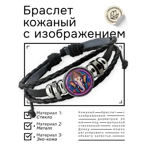 Кожаный браслет с изображением Ганеши. Изготовлен из синтетической кожи, металла и стекла, имеет регулируемый размер.